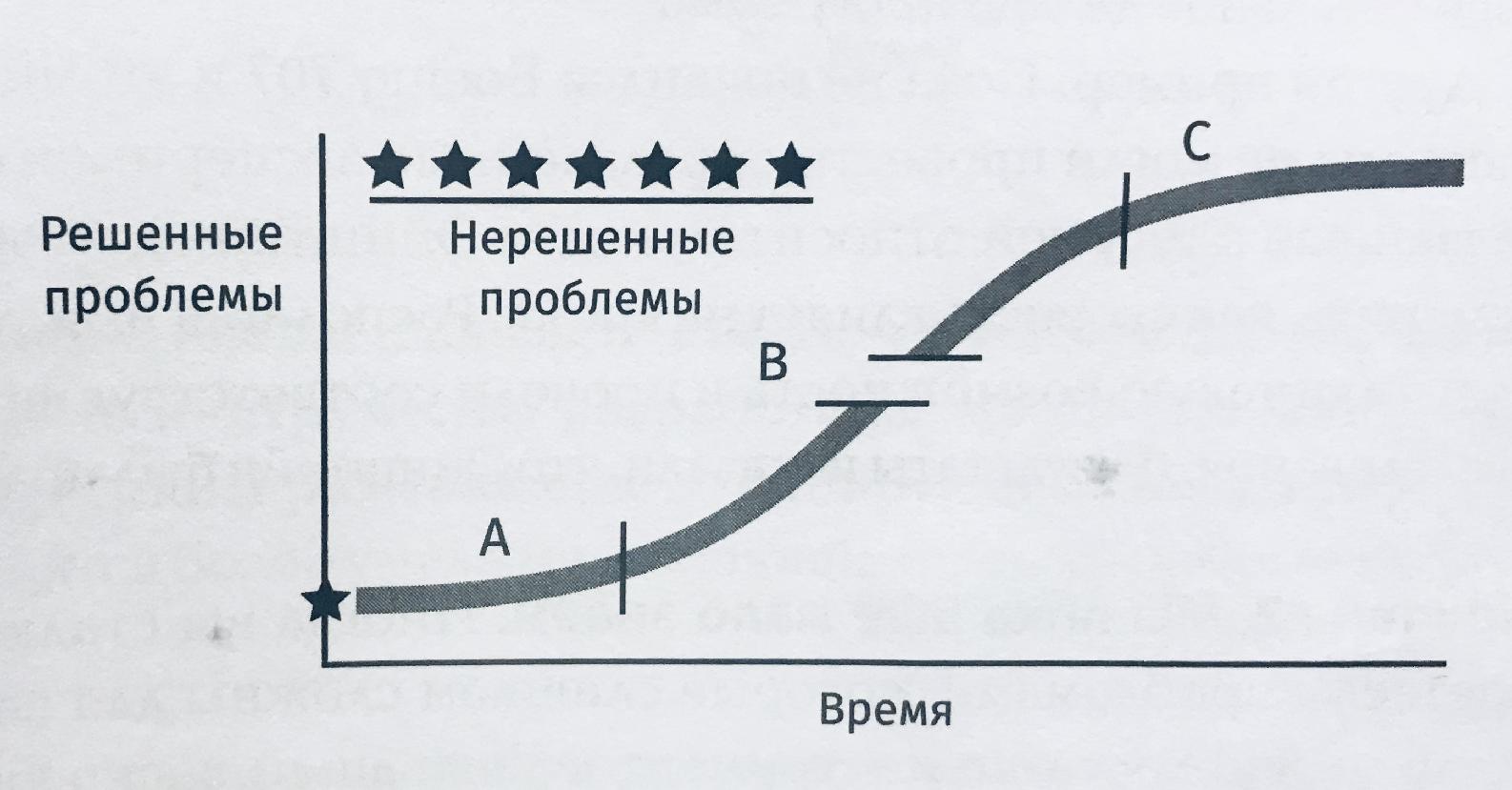 Третья стадия парадигмы — участок С – наступает, когда количество решенных проблем уменьшается. Это происходит, потому что сначала при помощи новой парадигмы решают наиболее простые проблемы, а сложные откладывают на потом. И это понятно, на сложные проблемы требуется больше времени, они стоят дороже.