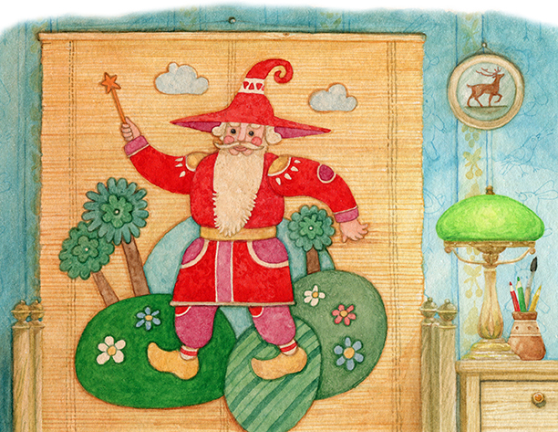 Жила-была маленькая девочка. Были у неё мама и папа. Мама любила покупать дочке книги со сказками и красивыми иллюстрациями. Она долго ходила по рядам книжного магазина и выбирала самые лучшие, самые красивые издания. А папа любил читать эти книги девочке и показывать ей страницы с картинками. А девочка любила рассматривать картинки и слушать сказки. Каждый вечер папа брал из шкафа книгу, усаживался на стул рядом с дочкиной кроватью и читал ей на ночь очередную сказку с выражением и по ролям. Если на странице была картинка, он прерывался и показывал её девочке. А та приподнималась на локте в кровати, долго смотрела на картинку, а потом говорила: «всё папа, читай, пожалуйста, дальше». Но однажды случилось так, что мама не успела купить новую книгу, а все, что у них были, оказались прочитанными. В тот вечер папа задумчиво обвёл глазами комнату. Над дочкиной кроваткой висел соломенный коврик с аппликацией из кусочков фетра. Маленький человечек с добрыми глазами и густой седой бородой шёл по лесной полянке и держал в руке палочку со звездочкой. На нём была широкополая шляпа, красный подпоясанный кафтан, шаровары и деревянные туфли. С минуту папа смотрел на человечка, а потом стал рассказывать…