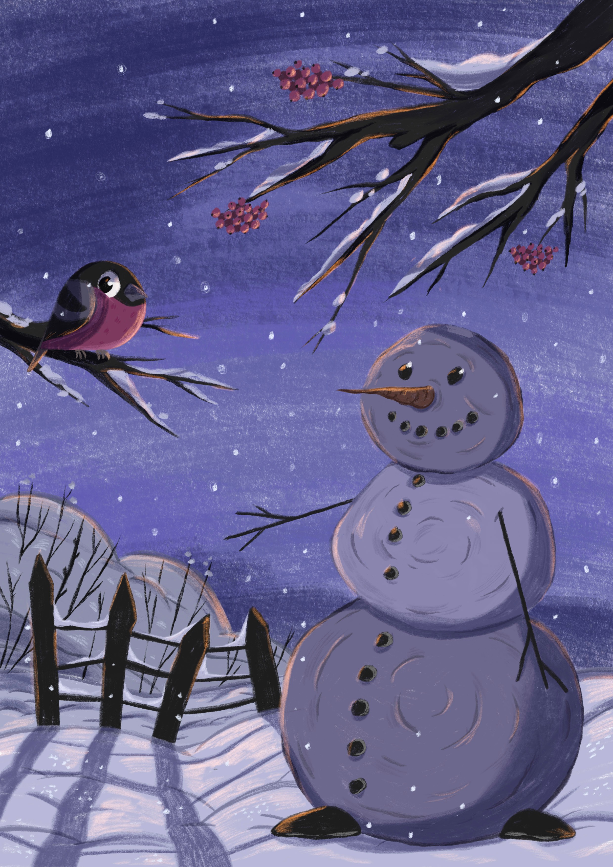 Ребята слепили замечательного снеговика. Нашли веточки для ручек. Даже камушки для глаз и ротика. А нос сделали из морковки. Варя, оказывается, взяла ее из дома. Их снеговик ещё долго радовал Эму и Чуню, когда они ходили гулять, то всегда проходили мимо него, чтобы полюбоваться.