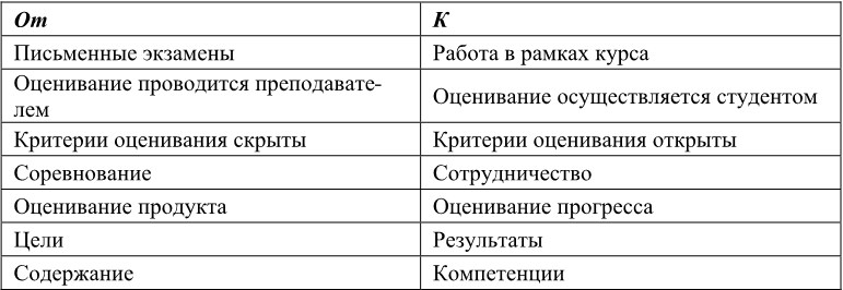 В связи со сдвигом целевых установок в образовании происходит сдвиг в системах оценивания: от традиционного оценивания по количественному признаку посредством письменных экзаменов – к качественному комплексному оцениванию в соответствии с целями обучаемых и ориентацией на образовательные результаты. Разница в упомянутых подходах представлена в табл. 1.1 [70].
