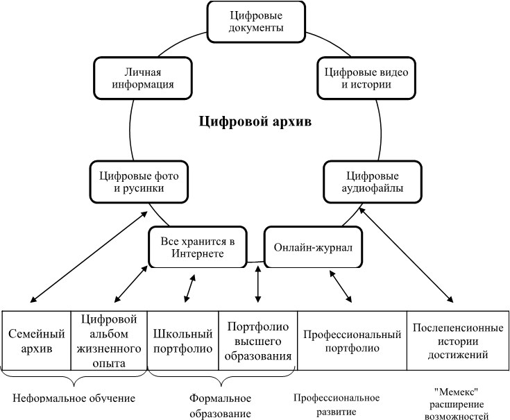 Огромную роль в системе формирующего оценивания в условиях эффективного использования ИКТ играет технология электронного портфолио как технология, включающая в оценочные процедуры семью обучаемых на протяжении всей жизни и создающая цифровой архив персональных образовательных достижений (рис. 1.3).