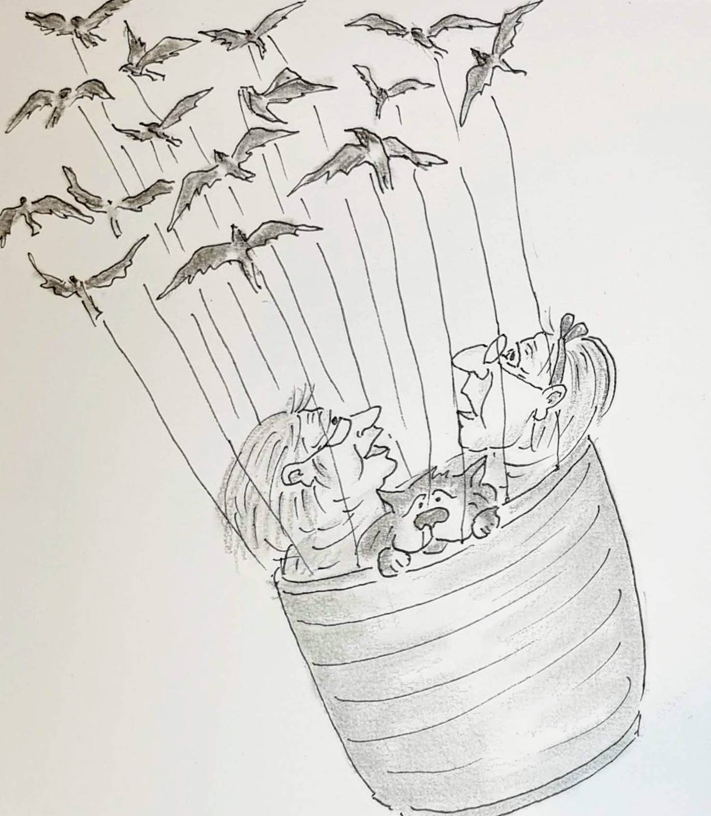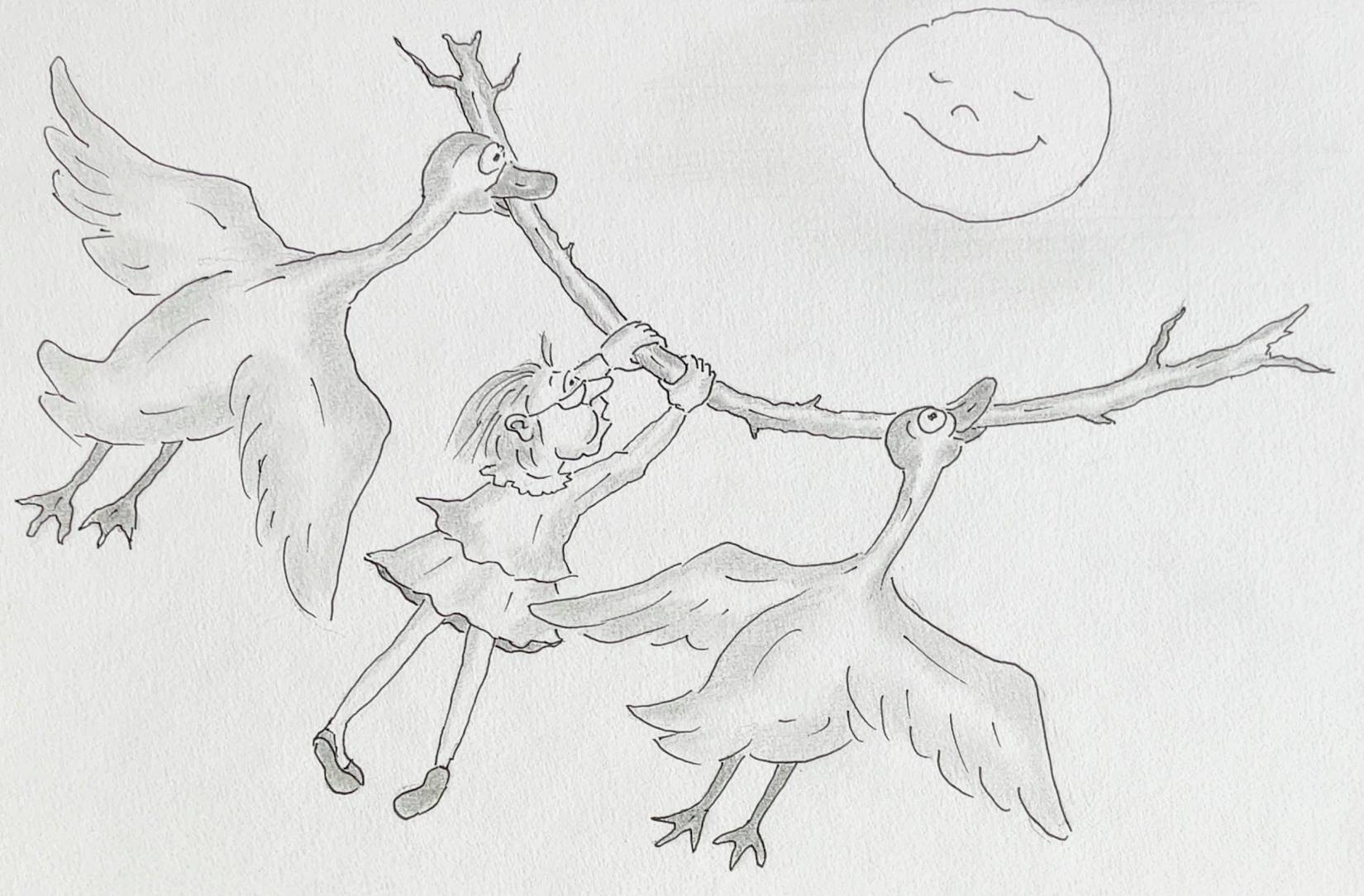 – …и я попросила двух самых больших гусей ухватиться за концы большой палки. А я… ухватилась за палку посередине! И мы полетели! На Луну!