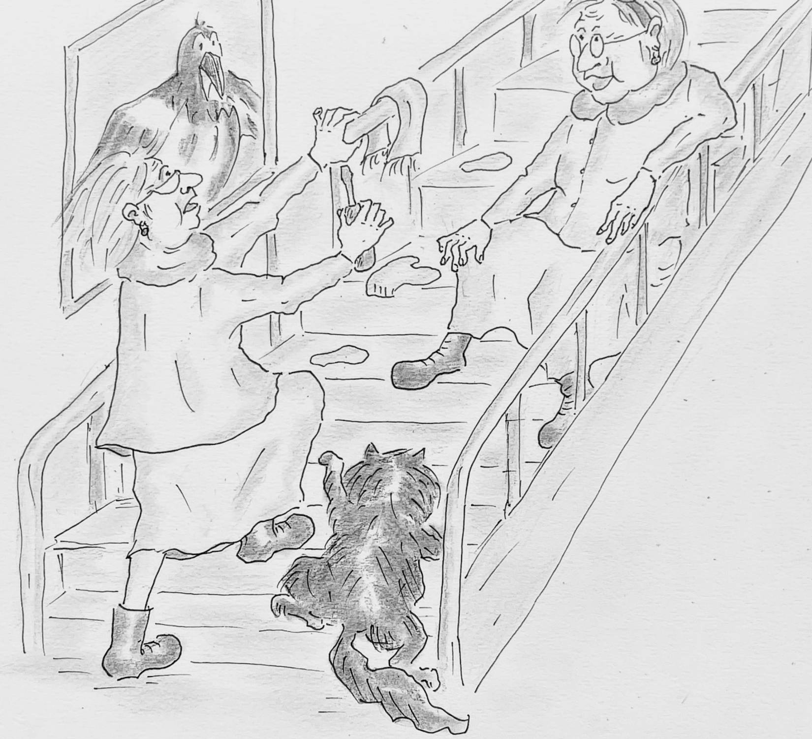Баба Гуся и Тётя Маша медленно поднимались наверх, а Муся прыгала сразу через две ступеньки.