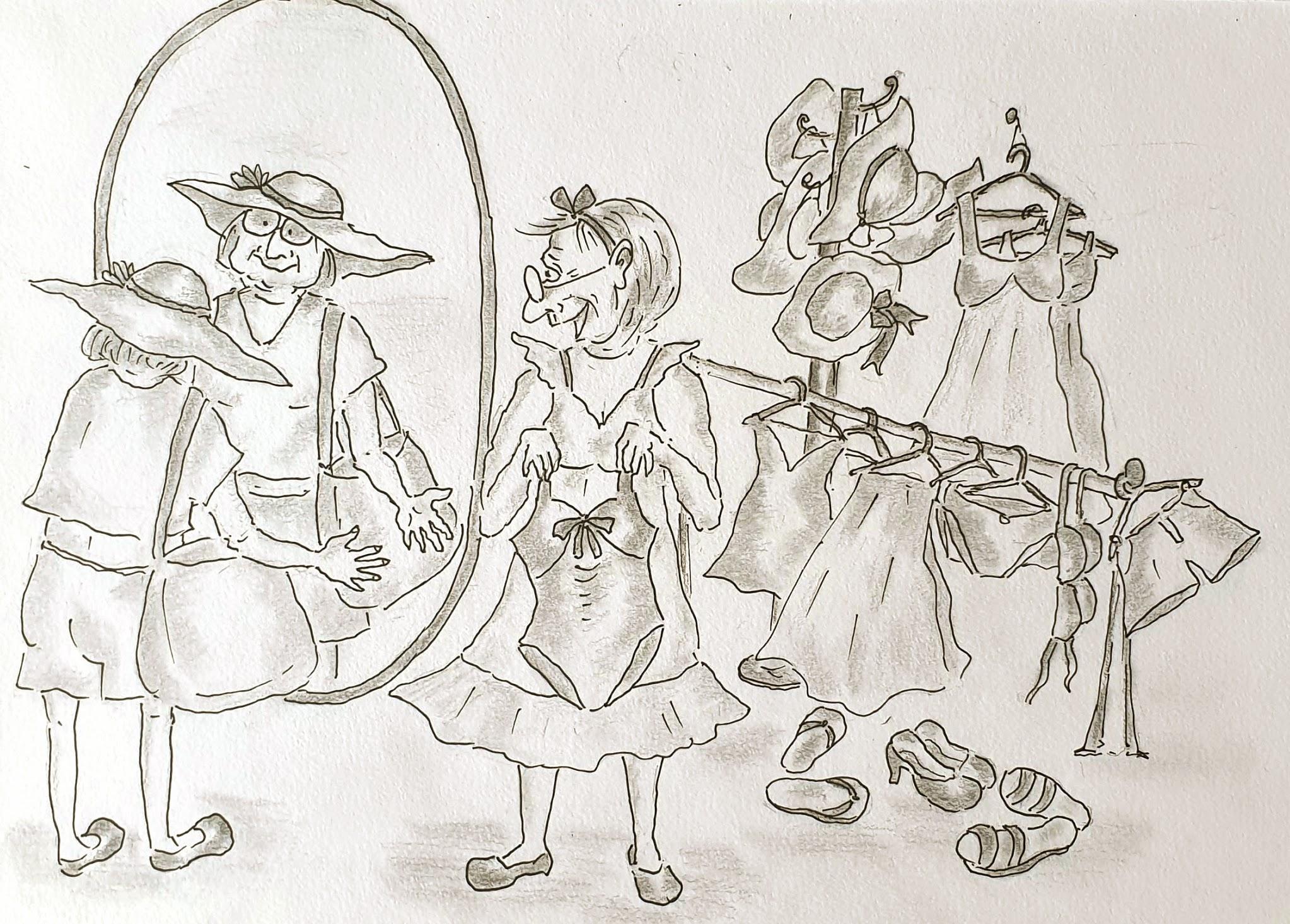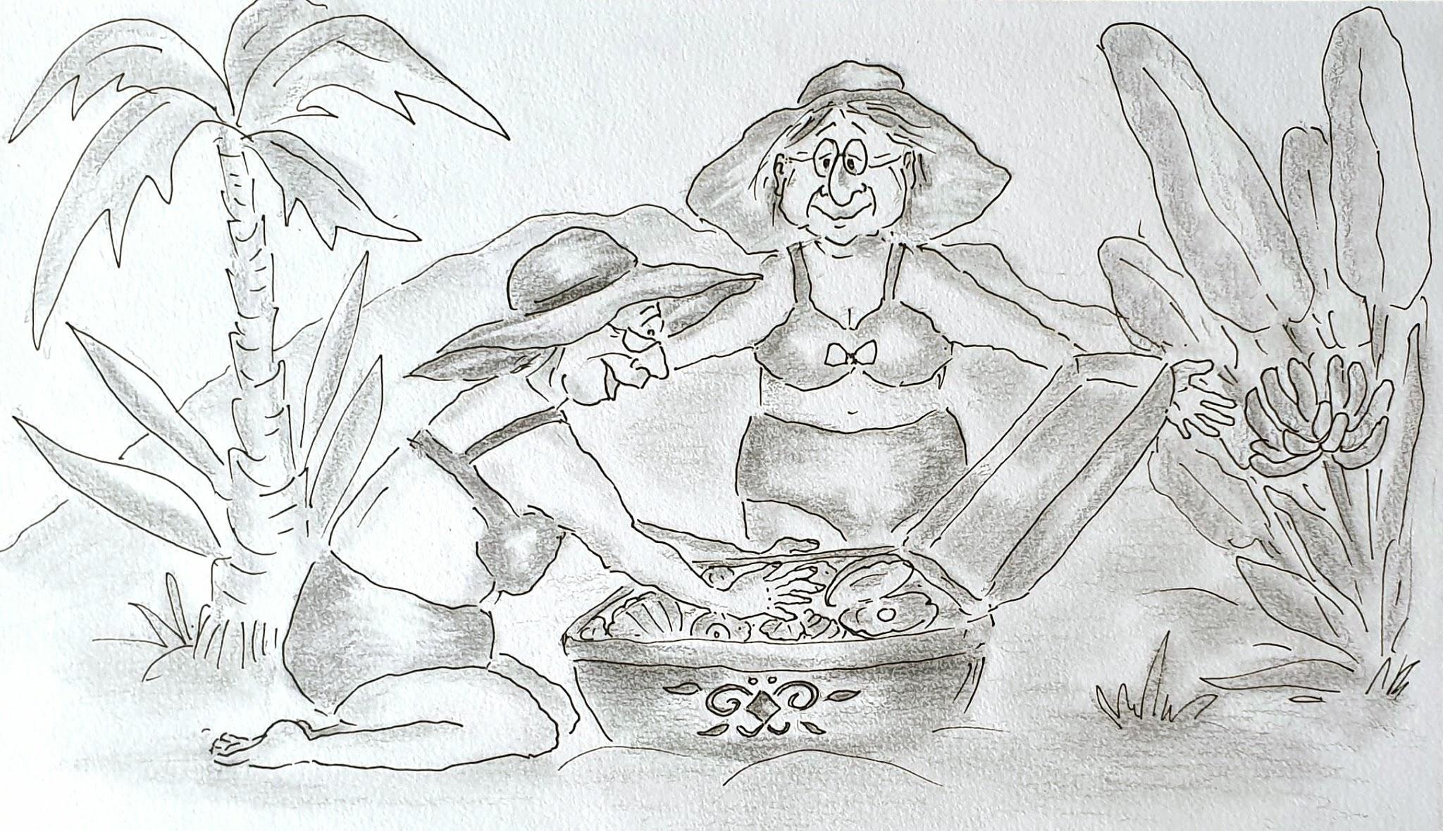 Баба Гуся и Тётя Маша отправились на закупки. Они долго выбирали купальники, платья, шорты и майки, не забыли и про солнечные очки и пляжные сумки. Наконец пришло время собирать чемоданы.