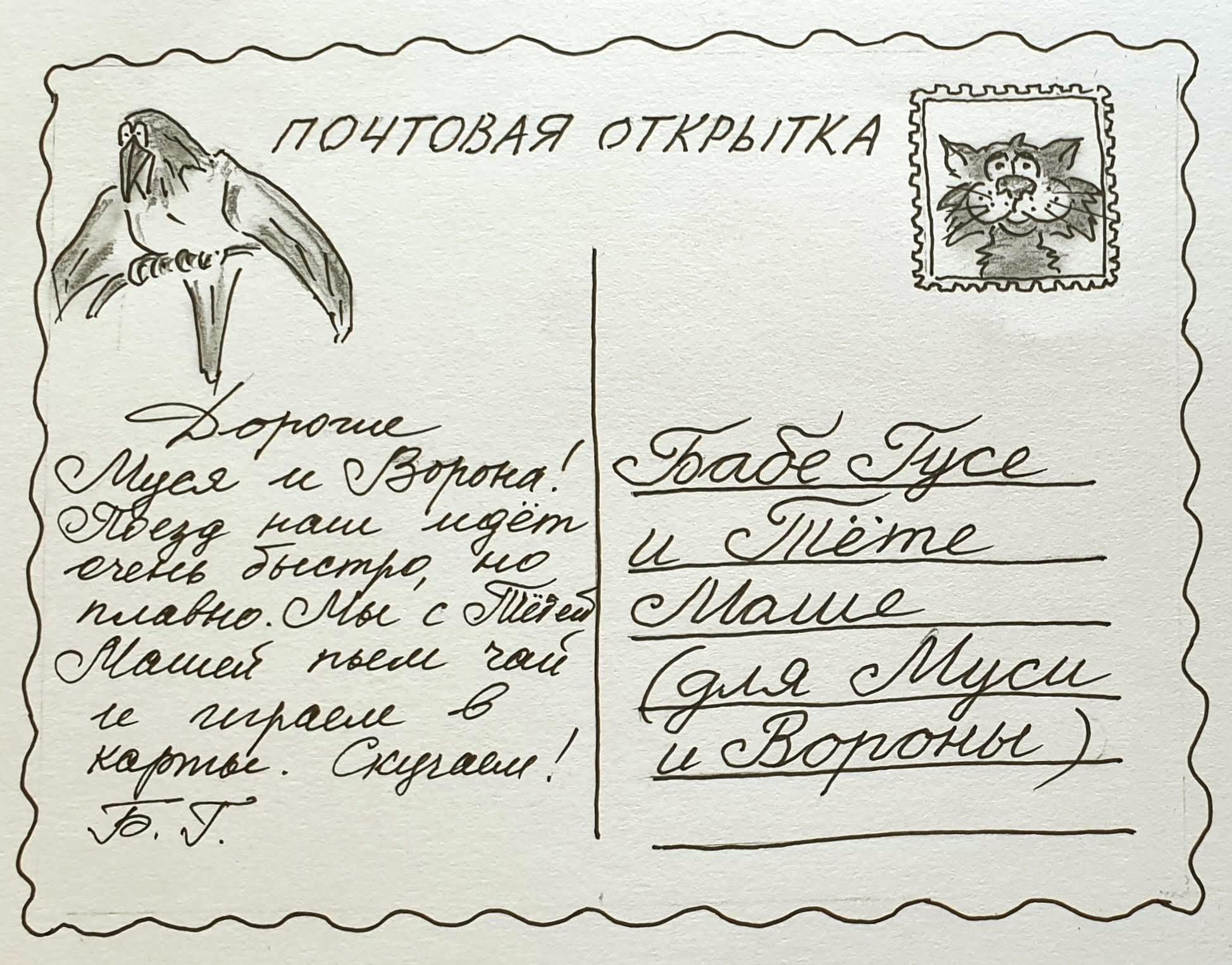 Поезд наш едет очень быстро, но плавно. За окном темно, мелькают леса, поля и какие-то странные тени… а мы с Тетей Машей пьем чай и играем в карты. Буду писать вам открытки, чтобы не скучать, и чтобы легче было потом рассказывать про наши приключения. Б.Г.