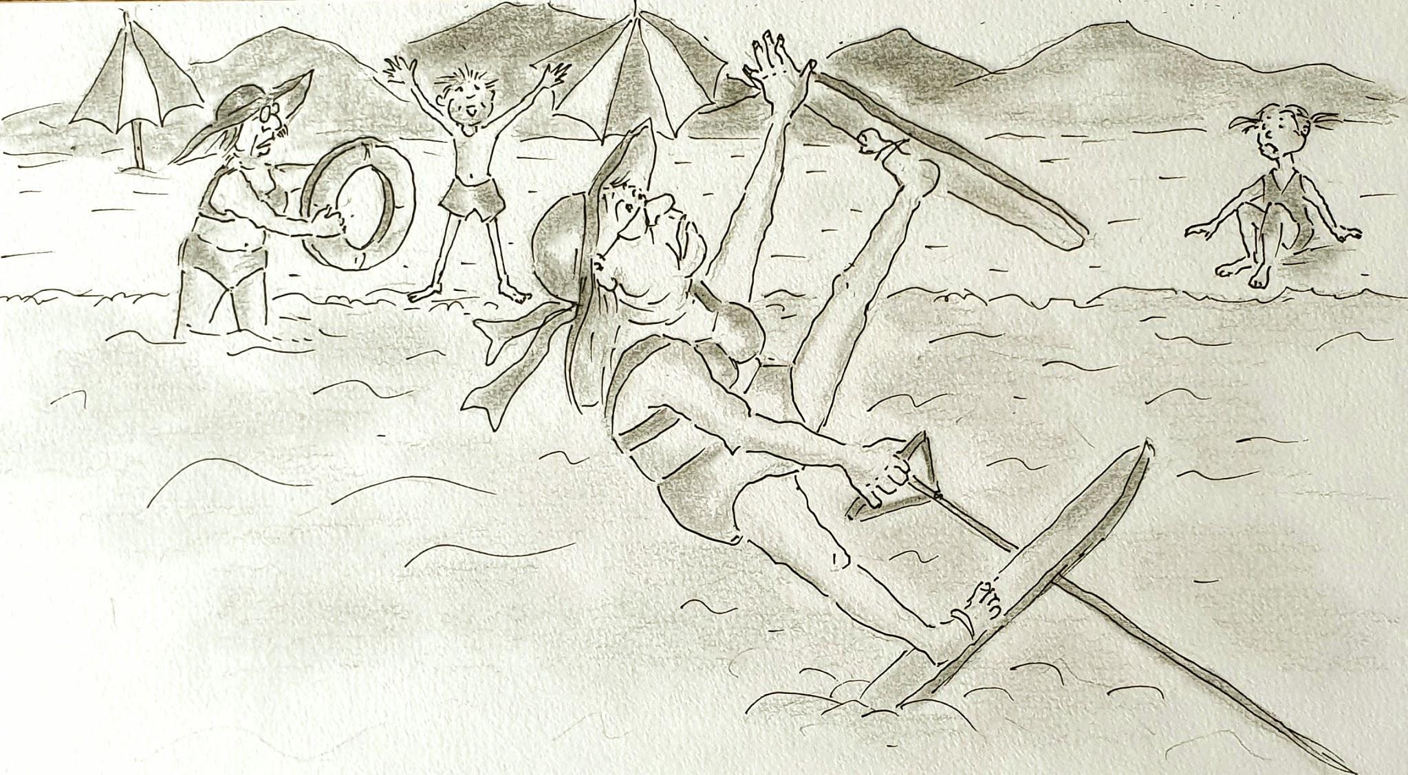 – Земля!! – вдруг закричала Тётя Маша. Лодка вместе с нами перевернулась и выбросила нас на песчаный берег… так мы попали на необитаемый остров…