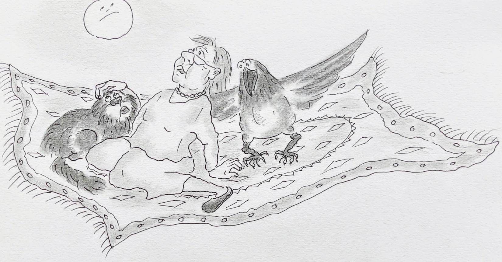 Бабе Гусе приснился сон. Она летела на Луну на ковре-самолёте. Рядом сидели Муся и Ворона. А Тёти Маши не было.