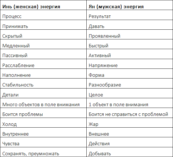 Мужская янская энергия несет в себе силу давать, дарить, делиться, распространять. Женская иньская энергия принимает, сохраняет, преобразует. Наиболее ярко эта дуальность проявляется в процессе зачатия ребенка: мужчина вкладывает семя, а женщина его принимает и, бережно сохраняя, рождает новую жизнь.