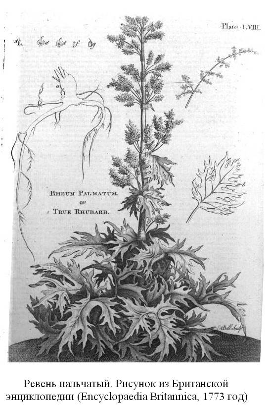 Между тем, неудача Ивана Чемоданова связана, скорее всего, с изначальной ошибкой в сортах ревеня. В России были известны два из них – черенковый и копытчатый. Первый произрастал в Сибири и имел листья «большие, кругло-продолговатые, нежным пухом покрытые с ровными стеблями». «Корень толстый, длинный ветвистый, который почти никогда не бывает цел, но всегда посередине загнивает». Вот почему этот сорт пользовался меньшим спросом, чем привозимый из Китая ревень копытчатый (Rheum palmatum), «на разведение которого в Сибири, тщетно употреблены были значительные издержки»165.