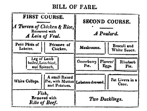 А энциклопедия «А Complete System of Cookery» (Лондон, 1816), оправдывая свое «всеобъемлющее» название, приводит даже графическую схему обеда и подачи блюд: