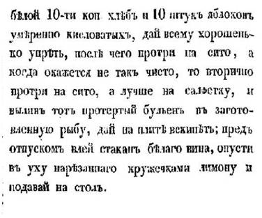 Обратите внимание на один интересный момент. У В. Похлебкина в главе, относящейся к описываемому времени, читаем: «Каждое рыбное блюдо готовили особым для той или иной рыбы способом. Поэтому и уху делали из каждой рыбы отдельно и называли соответственно – окуневой, ершовой, налимьей (мнёвой), стерляжьей и т. п., а не просто рыбным супом, как у других народов».189 «Кавардак» как раз не ложится в эту теорию, представляя из себя сборный, из разных рыб, суп.