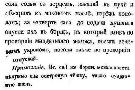 При всем изобилии рецептов, рыбная похлебка под названием уха отличается от супов, сваренных на рыбном бульоне (он может быть приготовлен как из одного сорта рыбы, так и из нескольких, из головизны, из рыбьих потрохов, раковый), где присутствуют всякого рода наполнители. Вот почему еще один кандидат на истинно русское рыбное блюдо – это борщ с жареными карасями. До сего дня, скажем, в Саратовской области его варят под названием «щи». С удивлением обнаружили его у Герасима Степанова (1851 год):