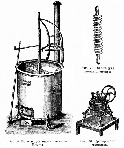 Вообще центров производства пастилы в России было три. Один – уже упомянутая Коломна. Другой – город Ржев. Как писал князь Мещерский в середине XIX века, производимая там пастила «более аристократического свойства». «Трехсортовая ржевская яблочная пастила, ценностью от 10 до 40 рублей за пуд, выделывается четырьмя или пятью семействами, и, кроме местного сбыта, находит мало покупателей вне губернии: выделывается ее приблизительно 500–600 пудов»218.