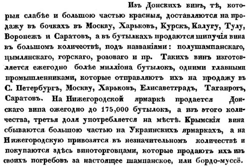 Основная же масса русского «шампанского» была незатейливой продукцией полукустарного производства с добавлением кизлярского молодого вина. «Все дешевые сорта так называемых мадеры, сотерна, жульена и т. п., продаваемые из погребов во внутренних городах, бывают приготовлены из Кизлярского чихиря, покупаемого на Нижегородской ярмарке»235.