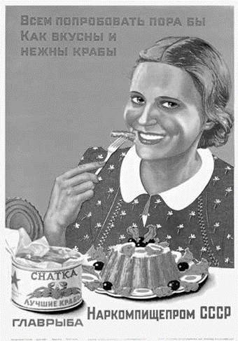 В конце 1930-х тональность пропаганды меняется. Фактически до середины 1950-х годов – это апофеоз продуктовой рекламы. Что, в общем, вполне объяснимо. Начала нового быта более или менее привились. А вот другая тема – роль государства в питании населения – стала преобладающей. Правительство и коммунистическая партия – вот настоящие кормильцы народа. А мудро руководимая ими пищевая промышленность – неиссякаемый источник продуктов и товаров. Не зря в иллюстрациях всегда подчеркивается марка изделия. Что бы ни было изображено на картинке, в глаза непременно должна бросаться этикетка. А на ней – Минпищепром, Главрыба, Росглаввино, Главликерводка, Главхлеб, – в общем, все те, кто обеспечивает достаток советских людей. Новой задачей стало и «продвижение» в массы относительно дорогих товаров: крабовых и лососевых консервов, осетровой икры и т. п. «Всем попробовать пора бы, как вкусны и нежны крабы!» – убеждает нас молодая женщина с самого запоминающегося плаката 1930-х годов работы А. Миллера.