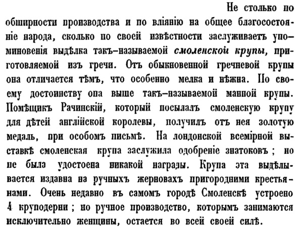 То есть смоленскую крупу получали в результате полной очистки гречихи от оболочек и внешней части зерна, а также полностью удаляя мучную пыль. Не удивительно, что этот продукт прекрасно усваивается, он хорош для жидких и вязких каш, биточков и запеканок. Завоевал он славу не только в России48: