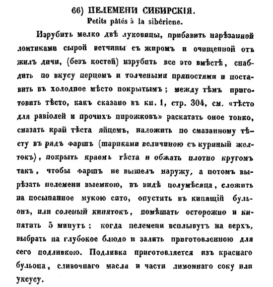 Вот почему к середине века пельмени приобрели свое устоявшееся название и начали триумфальный поход по русской кухне во всех уголках страны. Как иллюстрацию приведем один и первых печатных рецептов этого блюда (тут еще «пелемени») из изданного в 1855 году «Альманаха гастрономов» Игнатия Радецкого (см. фрагмент на следующей странице).