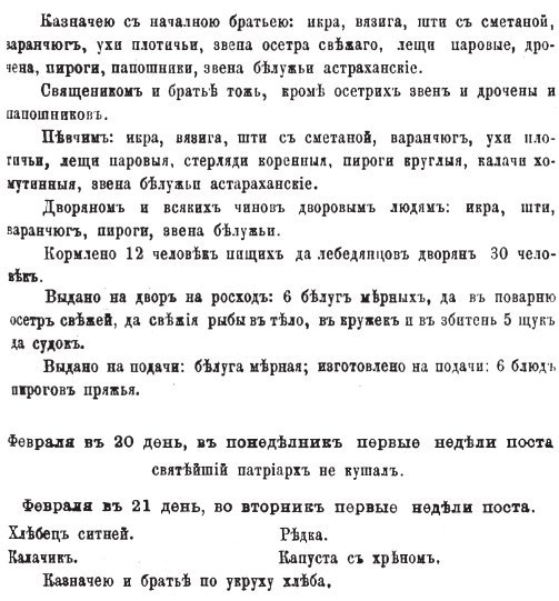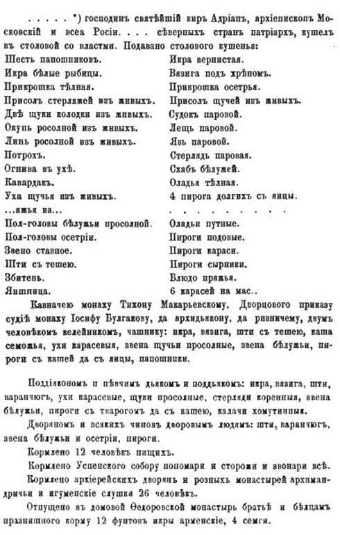 Чем они ценны? Во-первых, это, так сказать, квинтэссенция православной кухни. Если где-то и были отклонения от нее, то уж не за столом первосвященника Русской православной церкви. Во-вторых, эти блюда готовились профессиональными поварами, за долгие годы зарекомендовавшими себя с наилучшей стороны (других туда и не допускали). И в этом смысле они интересны нам как отражение высшего уровня кулинарии того времени. Заглянем в эти документы.