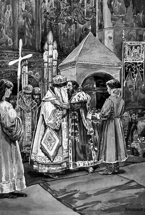 Царь христосуется с Патриархом в Успенском соборе (XVII в.)