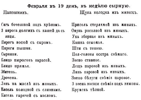 Не менее любопытен столовый обиход и во время Сырной недели. Так, в понедельник 13 февраля 1699 года в патриаршую келью было подано 27 блюд, во вторник – 39, в среду – 38, в четверг – 36, в пятницу – 32, в субботу – 30, а непосредственно в сырное воскресенье – только 26. Из этого видно, что его святейшество постепенно убавлял число блюд, готовясь к посту. В первый день Великого поста сам патриарх ничего не ел. В последующие же дни употреблял только ситный хлебец с калачиком «да попробовал редьки и капусты с хреном, а казначею и братие приказал выдать лишь по краюшке хлеба».