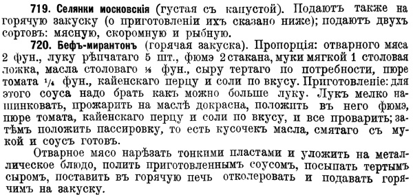 А вот рецепт из кулинарной книги начала XIX века105, где эта селянка, рассматривается как горячая закуска и именуется беф-мирантон: