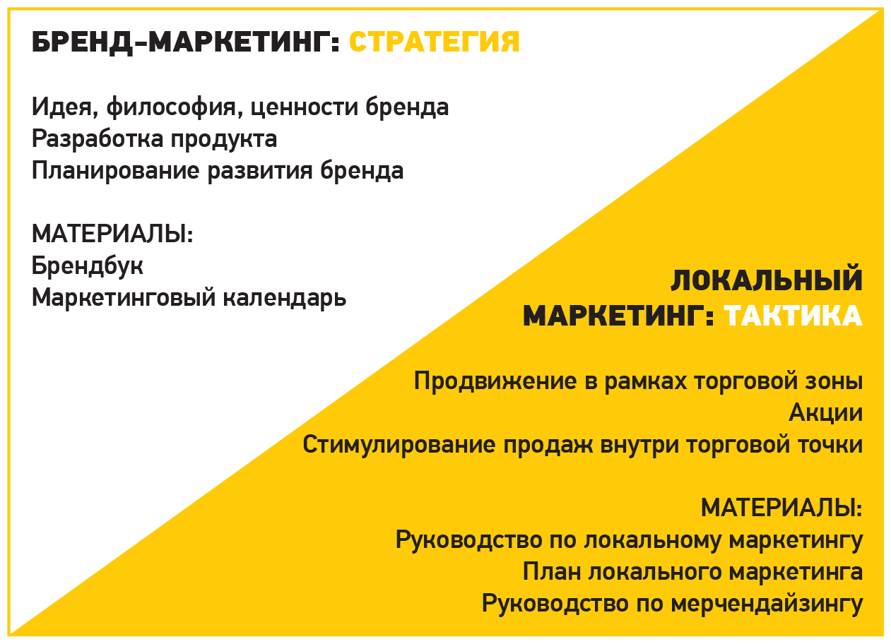 Различия между двумя направлениями маркетинга – бренд-маркетингом и локальным маркетингом – кардинальные. Бренд-маркетинг относится к стратегии. Его задачи: формулирование идеи, философии и ценностей бренда, позиционирование и стратегия развития, исследование аудитории, а также разработка продуктов и услуг. Локальный маркетинг – это тактика, деятельность, которая, безусловно, отражает идею бренда, но сфокусирована на конкретных механиках удержания и привлечения трафика.