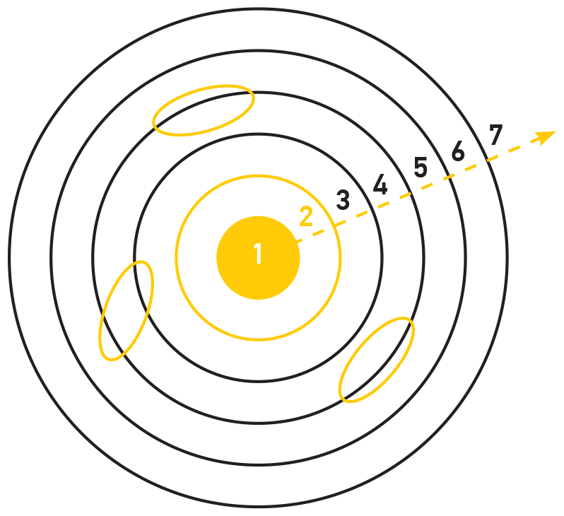 Круг номер 1 относится к активностям, которые можно воплотить внутри заведения, круги от 2 до 7 расположены в порядке географической удаленности от ресторана: