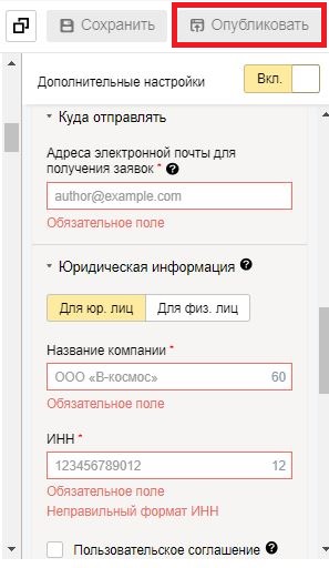 Но перед этим нужно будет заполнить всю необходимую информацию о себе: указать адрес электронной почты для сбора заявок, а так же всю информацию о юридическом лице или свой ИНН. Люди ценят прозрачность информации, ну а уж Яндекс – и подавно.