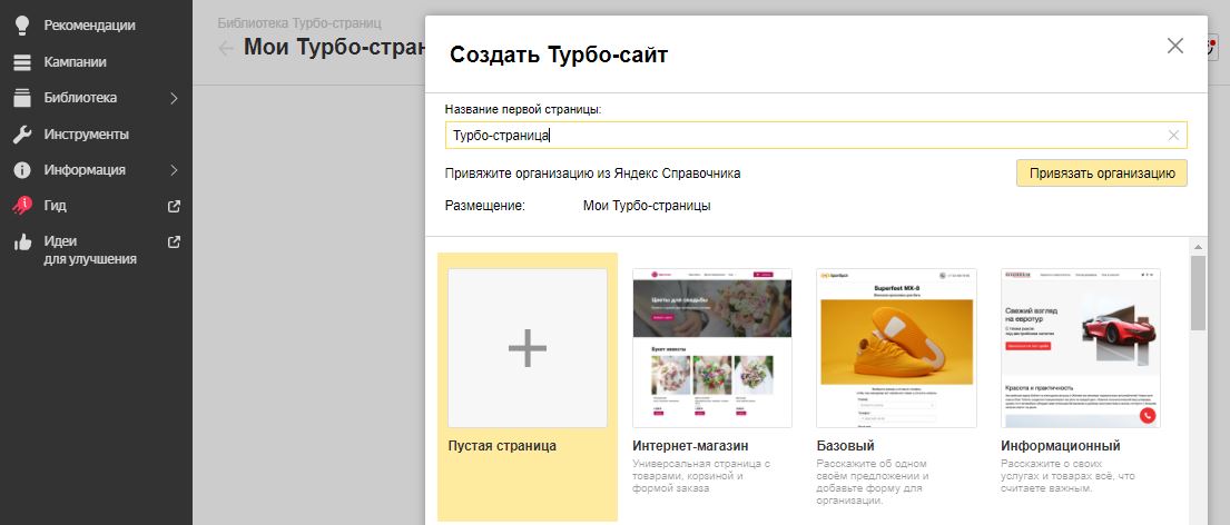 Теперь выбираем шаблон. Несмотря на несколько небольшое количество вариантов, на Яндекс.Турбо можно подобрать шаблоны, наиболее подходящие именно вашему виду деятельности. Так, если вы предлагаете одну (или несколько) услуг, смело выбирайте "Базовый" шаблон или "Лэндинг". Если же вам нужно что-то посложнее – отлично подойдет шаблон "Информационный", ну а для создания интернет-магазина выбор очевиден.