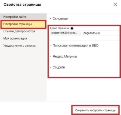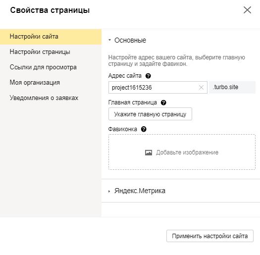 Перед началом работы нужно задать основную страницу сайта, т.е. его "обложку", а так же придумать домен. Как я уже отметила выше, на Яндекс.Турбо нельзя подключить свой собственный домен к создаваемому сайту, но это не беда – придумываем свое название и сохраняем все изменения.