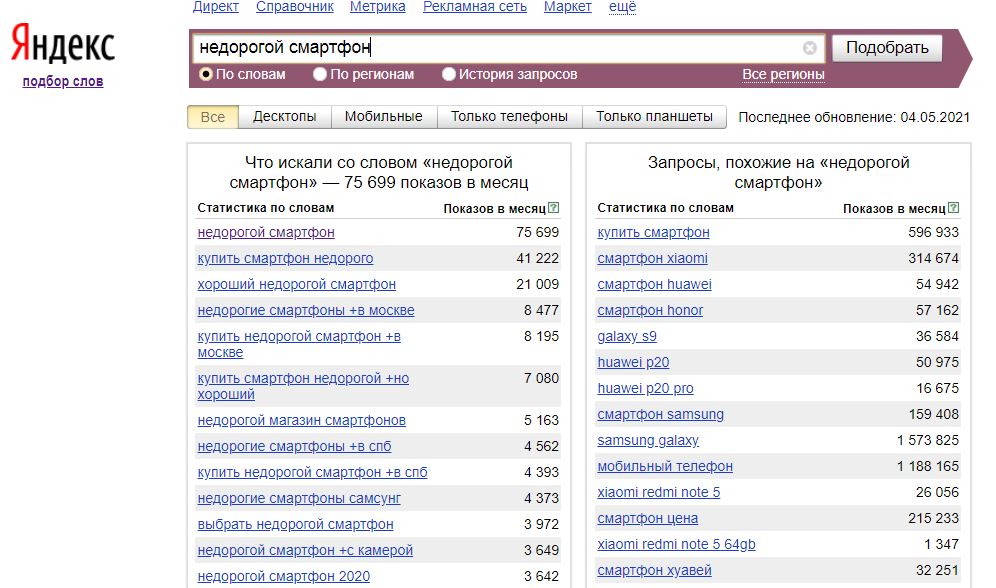 Такие слова, описывающие ваш сайт, называются "поисковыми запросами". Почему запросами? Когда сторонний пользователь пробует искать нужный ему продукт или услугу, он еще о вас ничего не знает. И он задает ("запрашивает") в поисковой системе (в России это – традиционно Яндекс, реже – Google) некоторую фразу, которая, как он думает, поможет ему найти нужный продукт. Например, пользователь может задать такую поисковую фразу: "недорогой смартфон". Поисковая система проанализирует все товары и продукты, которые есть поблизости от задавшего вопрос, и покажет их в определенном порядке.