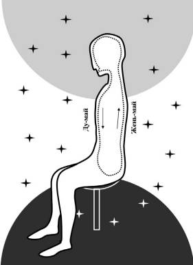 Согласно древнекитайской медицине в нашем теле имеется 32 канала, по которым течет ци. В этой книге мы подробно ознакомимся с двумя основными. По одному из них ци движется вверх к макушке вдоль позвоночного столба вместе со спинномозговой жидкостью (управляющий канал, ду-май), по второму – вниз по передней поверхности тела (функциональный канал, жэнь-май). Вместе они образуют микрокосмическую орбиту (рис. 3).