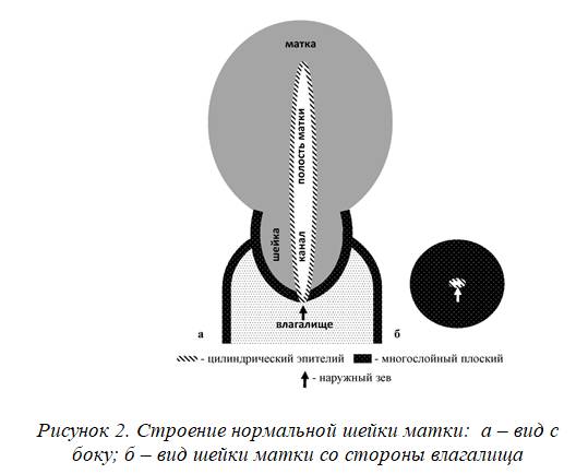 Снаружи влагалищная порция матки, также как и все влагалище, покрыта многослойным плоским эпителием (рис. 2). Внутри шейки матки находится цервикальный канал. Он с одной стороны соединен с полостью матки, а с другой – заканчивается небольшим отверстием (наружным зевом), через которое во время менструации из матки во влагалище выходит кровь.