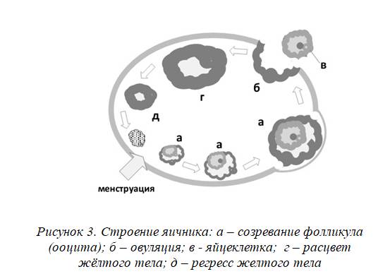 После овуляции из фолликула образуется желтое тело (рис. 3 г), вырабатывающее прогестерон. Если яйцеклетка не была оплодотворена, желтое тело подвергается обратному развитию (рис. 3 д), начинается менструация. Если же произошло оплодотворение, формируется желтое тело беременности, поддерживающее рост и развитие плода.