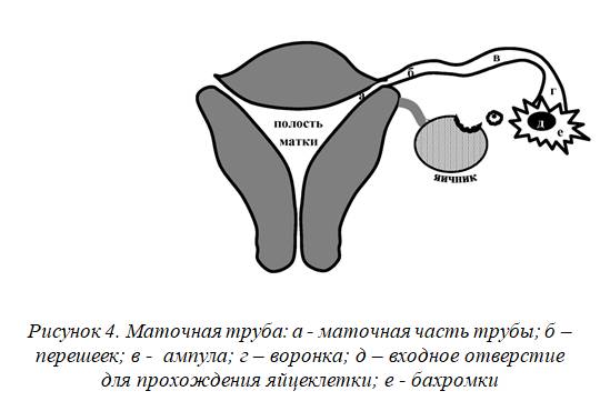Различают несколько отделов маточной трубы (рис. 4): маточная часть (а), перешеек (б), ампулу (в) и воронку (г). Воронка маточной трубы имеет отверстие (д) диаметром до 2 мм для прохождения яйцеклетки. Оно окаймлено большим количеством остроконечных выростов – бахромок (е). Каждая бахромка по своему краю имеет мелкие вырезки.