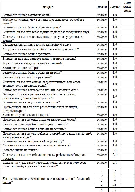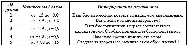 Каждый результат, записанный вами в таблицу, характеризует соответствие состояния отдельного органа или системы организма той или иной возрастной группе. Для определения вашего биологического возраста сложите все полученные числа из последней колонки и разделите результат на 8.