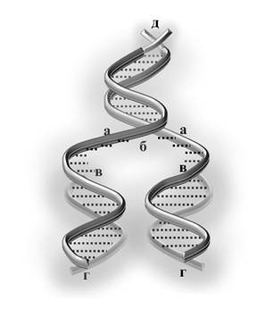 Воспроизведение клеток происходит посредством репликации ДНК (рис. 1, а-в, д-е). При этом она раскручивается на две цепочки РНК (а). Они расходятся, образуют репликационную вилку (б). Затем каждая цепь РНК становится матрицей, на которой достраивается аналогичная цепь (в). В результате образуются две новые двуспиральные молекулы ДНК (г), идентичные родительской молекуле.