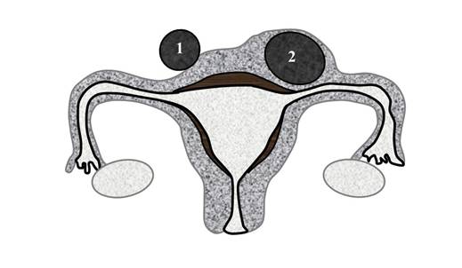 Рисунок 3. Субмукозная миома (1) матки и аденомиоз (2)