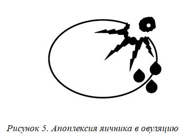 В то же время разорваться может и абсолютно нормальный яичник, не содержащий кисту. Это происходит во время овуляции (рис. 5). Очень многие женщины «чувствуют» выход яйцеклетки из яичника, регулярно испытывая в середине цикла невыраженные боли (овуляторный синдром).