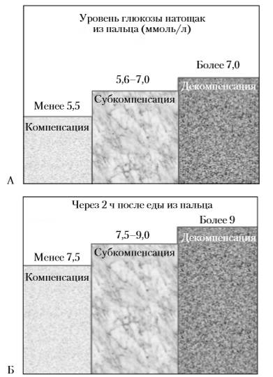Рисунок 7. Оценка степени компенсации углеводного обмена у больных сахарным диабетом при самоконтроле по уровню глюкозы (ммоль/л): А – натощак, Б – через 2 часа после еды