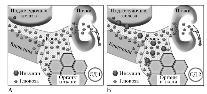 Рисунок 4. Обмен глюкозы при сахарном диабете: А –1-го типа, Б – 2-го типа
