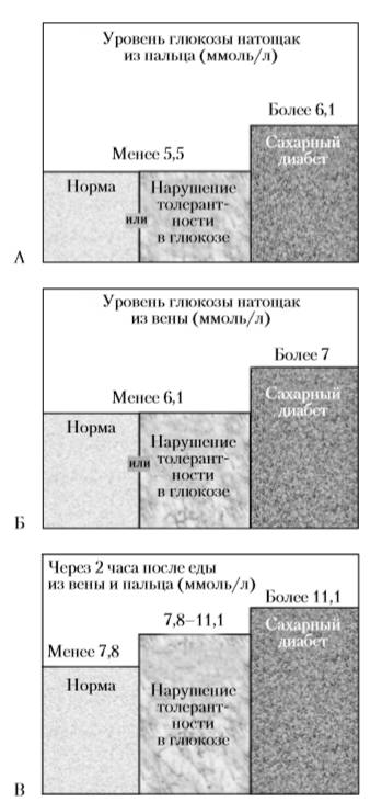 Рисунок 5. Диагностические критерии сахарного диабета. Уровень глюкозы (ммоль/л): А – натощак из пальца; Б – натощак из вены; В – через 2 часа после еды