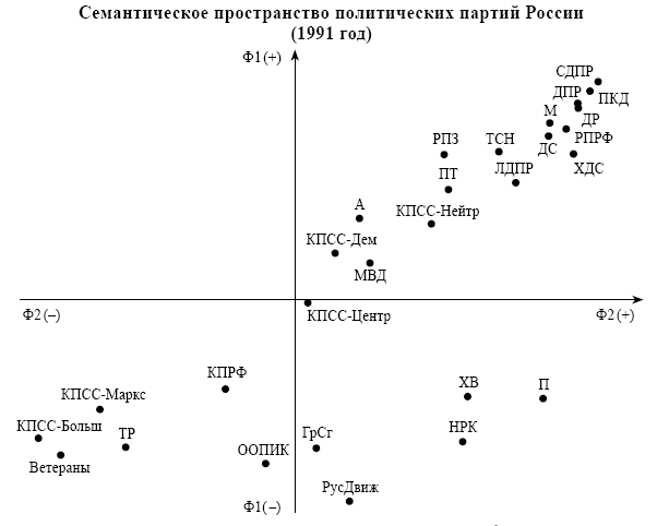 Величину, обратную дисперсии, можно интерпретировать как меру идеологического единства. Снижение размерности первичных переменных позволяет выделить основания (категории), определяющие сходство/ различие политических партий, ведущие линии социального напряжения, проинтерпретировав содержание каждой категории, установить размерность политического пространства как показателя дифференцированности политической жизни общества и когнитивной сложности общественного сознания. Позиции каждой партии представлены как координатные точки внутри этого пространства. Через проекцию позиции партии на оси категорий-факторов можно определить, насколько выражен тот или иной политический аспект, соответствующий содержанию фактора. Расстояния между координатами партий в семантическом пространстве обратно пропорциональны сходству их политических установок. Используя кластерный анализ, можно построить дендрограммы, или кластерные структуры, представляющие группировку партий согласно сходствам их политических установок, и таким образом предсказать их возможные политические альянсы.