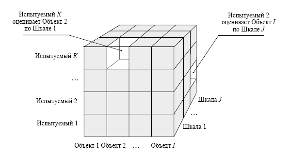Для широкого круга социально-психологических и социально-политологических исследований важно изучать не усреднённое мнение людей, а политические идеи (идеологемы), политические конструкты, распространённые в обществе. Ставится задача построения политической типологии граждан, выделения типов политической ментальности. При этом необходимо помнить, что психосемантические данные имеют не двумерную, а трёхмерную структуру. Массив данных образован тремя измерениями: шкалы-дескрипторы; объекты анализа; респонденты (испытуемые). Каждый элемент массива – единичный кубик – это оценка одним респондентом одного объекта по одной шкале. Собранные вместе кубики составляют параллелепипед (рис. 4 на с. 38). Для решения ряда задач с использованием многомерной статистики можно отдельно рассматривать сечения по разным основаниям: испытуемым, объектам, шкалам (Митина, 2006).