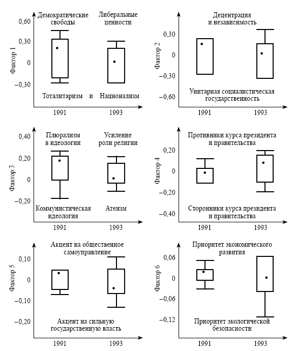 Рис. 5. Боксплоты факторов семантического пространства российского общества в сопоставлении 1991 и 1993 гг.