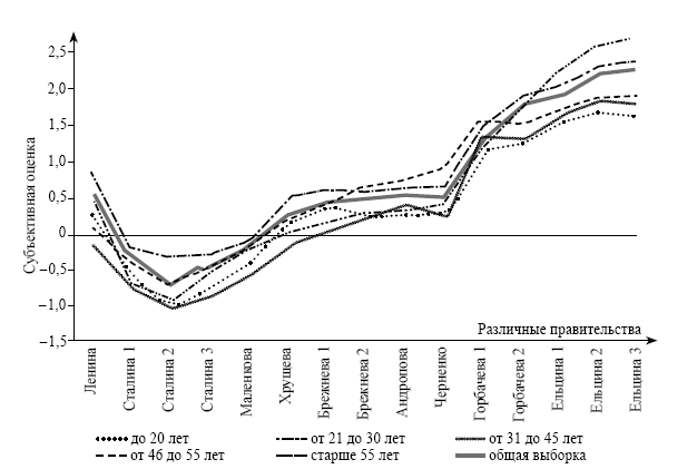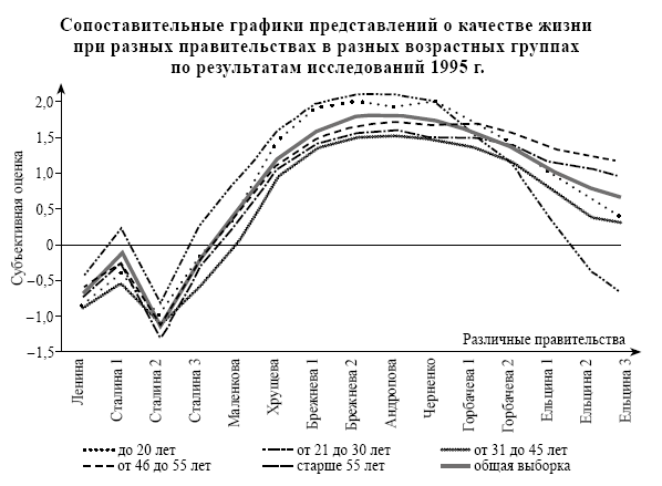 Респондентов различного возраста просили оценить по градуальной шкале качество жизни населения при том или ином правительстве. Полученный массив данных анализировался с помощью методов многомерной статистики (в частности, эксплораторного и конфирматорно-го факторного анализа) с целью построения семантического пространства, описывающего динамику качества жизни россиян за весь период советской и постсоветской истории. Анализ обнаружил три независимых фактора, к которым сводятся многочисленные аспекты качества жизни: политические свободы, материальное благополучие и осмысленность жизни. Для первых двух факторов графики динамики качества жизни практически совпали в различных возрастных группах (рис. 6 а, б). Иными словами, для пожилых людей, помнящих правление Н. С. Хрущёва, и для молодёжи, родившейся в годы правления Б. Н. Ельцина, динамика этих составляющих качества жизни в диапазоне всей российской истории с 1917 г. по настоящее время совпадает.