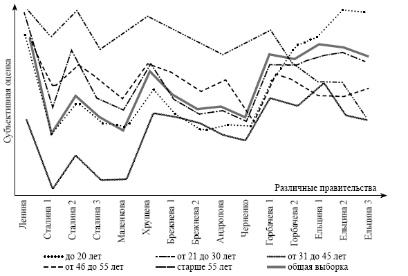 Сопоставление рисунков 6 и 7 приводит к заключению о том, что материальное благополучие и политические свободы – более объективные и в большей степени верифицируемые конструкты. Графики по этим двум факторам совпадают у респондентов, проживавших в различные исторические периоды, различавшихся по возрасту, социальному и профессиональному статусу (Петренко, Митина, 2012). Ситуация с третьим фактором – с представлениями об осмысленности жизни – совершенно иная. Локальные вершины и спады для старшего и младшего поколений существенно различаются. Интерес представляет также настораживающее расхождение в показателях по фактору «осмысленность бытия» для периодов правления И. В. Сталина и Б. Н. Ельцина. Исследование показывает, что знание истории государства, крайне важное для формирования политической позиции гражданина, тем не менее не определяет жёстко его позиции по отношению к этой истории. Видимо, существует некий духовный камертон, настраивающий пассионарность общества, относительно независимый от уровня материальных благ и политических свобод.