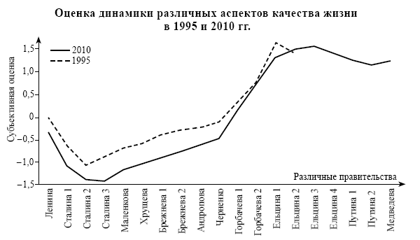 Как говорил Ф. Ницше, «можно пережить любое как, если знаешь зачем». На восприятие качества жизни влияет не только наличие материальных благ, но и ощущение субъектности собственного бытия – того, что ты творец своей жизни. Качество жизни зависит и от теплоты общения в семье, в рабочем коллективе, в обществе. Оно связано с отсутствием военных угроз и природных катаклизмов, включает в себя веру в счастливое будущее для себя и своих детей, возможность получить хорошее образование, квалифицированную медицинскую помощь и т. п. В наших исследованиях (Петренко, Митина, 1997, 2009, 2012), посвящённых представлениям населения России о качестве жизни в различные периоды истории страны, ролевыми позициями выступали образы правительств (от ленинского до путинского), а дескрипторами – несколько десятков суждений о различных аспектах качества жизни.