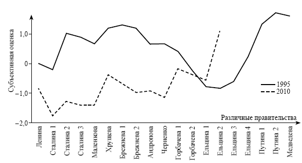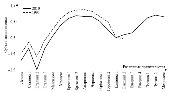 В качестве «маркеров» исторических периодов России были использованы: правительства Ленина (1917–1924 гг), Сталина (“Сталин 1” – 30-е гг., “Сталин 2” – 40-е (военные) гг., “Сталин 3” – послевоенные годы, начало 50-х), Маленкова, Хрущева, Брежнева (“Брежнев 1” – конец 60-х, “Брежнев 2” – 70-е гг), Андропова, Черненко, Горбачева (“Горбачев 1” – правительство Горбачева – Рыжкова, “Горбачев 2” – правительство Горбачева – Павлова), Ельцина (“Ельцин 1” – правительство Ельцина – Силаева, “Ельцин 2” – правительство Ельцина – Гайдара, “Ельцин 3” – правительство Ельцина – Черномырдина 1994 г., “Ельцин 4” – правительство Ельцина – Черномырдина 1995 г.), Путина (“Путин 1” – 1999–2004, “Путин 2” – 2005–2008), Медведева (2008–2012).