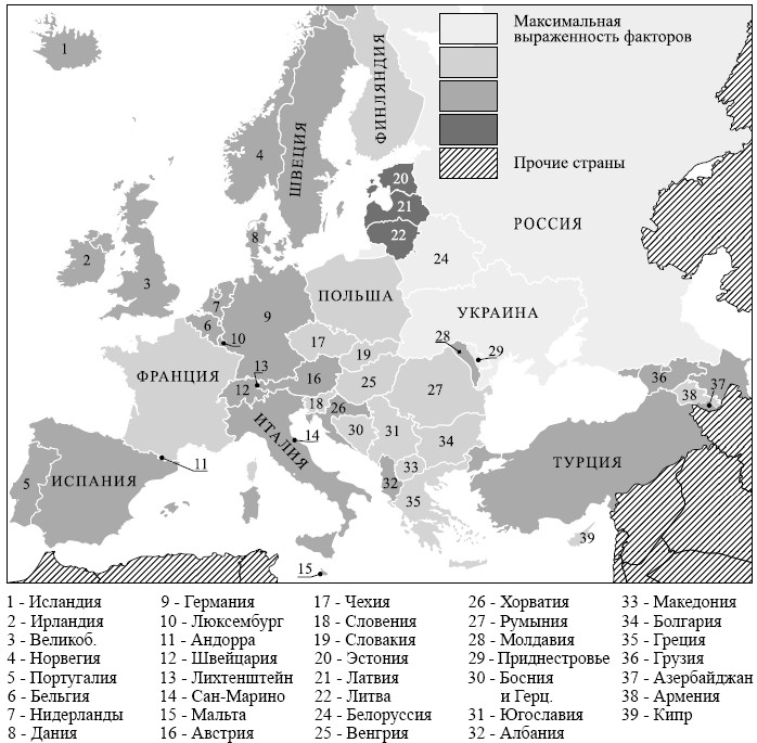 В психологической науке проблеме этнических авто- и гетеростереотипов посвящено огромное количество исследований в области фаворитизма и этноцентризма (Berry, 1990; Tajfel, Turner, 1986; Triandis, 1994; Дробижева, Аклаев, Солдатова, 1996). Значительно меньше исследований стереотипов восприятия стран как субъектов международной политики, а также исследований системы категорий, через призму которой воспринимаются и оцениваются те или иные страны. Эта задача решается нами путём построения семантических пространств (Petrenko, Mitina, Bert-nikov, 2003), где объектами оценок по множеству дескрипторов (характеризующих уровень развития экономики, культуры, политических свобод и демократических принципов, состояние вооружённых сил, религиозность общества и т. п.) выступают образы стран – их авто- и гетеростереотипы. Специфика психосемантической картографии геополитического пространства (мира, Европы, СНГ и т. п.) заключается в том, что путём наложения субъективных семантических пространств на географические карты мы получаем зрительно субъективные геополитические пространства. Раскрашивая эти карты согласно степени выраженности того или иного фактора, мы получаем визуально читаемый целостный образ места России в содружестве стран в том или ином экономическом или политическом аспекте, например, карту толерантности, дружественности окружающих государств по отношению к России, степени экономического партнёрства или культурного взаимообмена и т. д. Пример такой карты по фактору дружественности России по результатам исследования 2000 г. представлен на рис. 8 (см. с. 48).